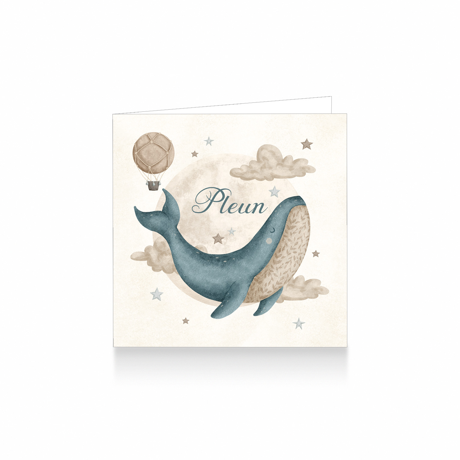 2210-Onder de zee aquarel Ocean geboortekaartje voor een meisje uit de collectie Ocean Dream. Op dit prachtige waterverf kaartje zie je een walvis tussen wolken, luchtballon en sterren met de maan op de achtergrond.