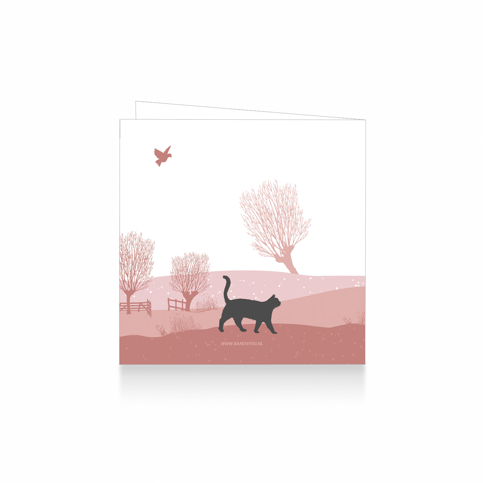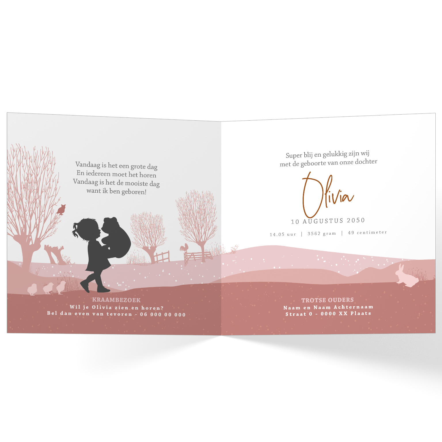 404-Super leuk silhouet geboortekaartje voor een meisje. Op dit leuke kaartje zie je een meisje met teddybeer en kuikentjes die haar volgen in een Hollands landschap met knotwilgen en in de lucht zie je een luchtballon
