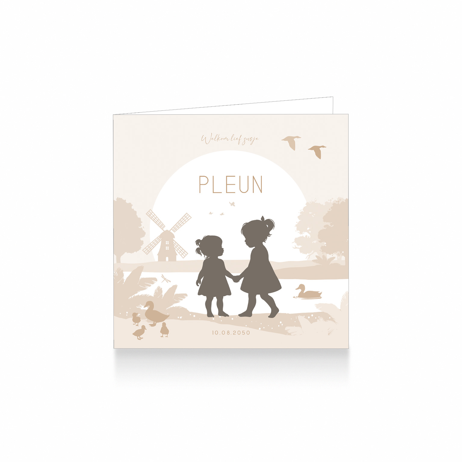 429-Trendy silhouet geboortekaartje voor een tweede kindje, een meisje. Op dit leuke kaartje zie je grote zus met haar kleine zusje hand in hand langs de waterkant in een Hollands landschap met molen, water, eendjes en bomen. Het kaartje is in alle kleuren aan te passen.