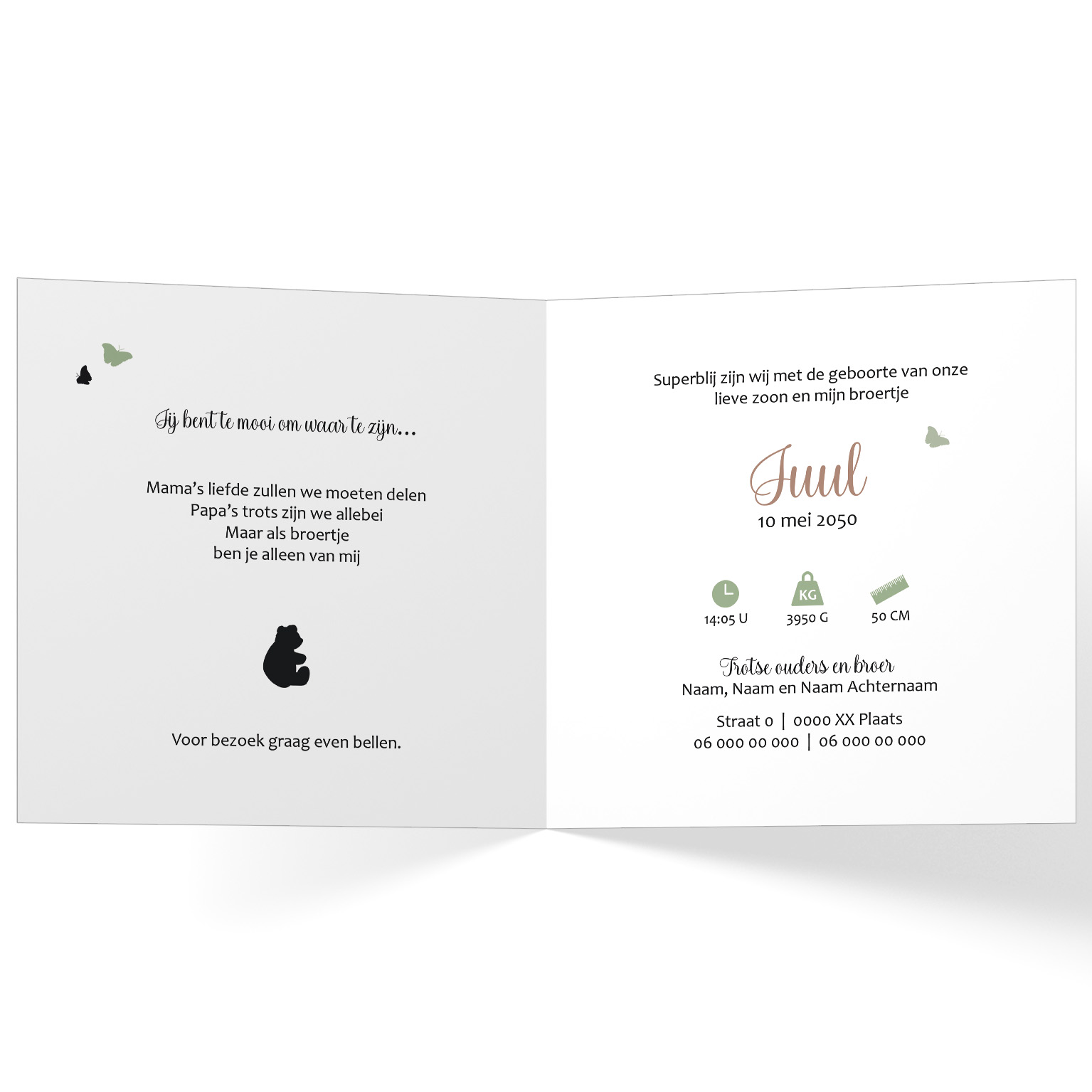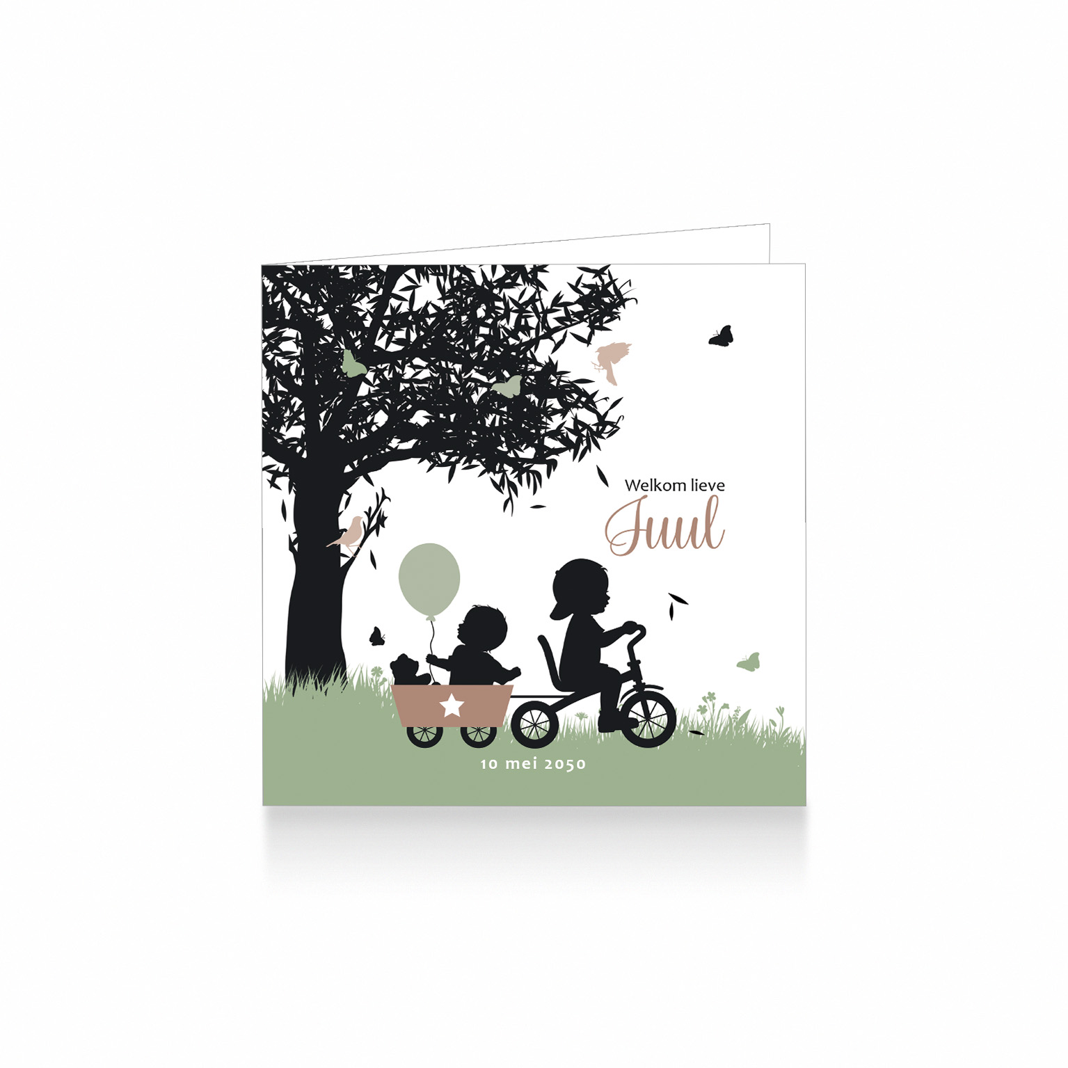 437-Hip silhouet geboortekaartje voor een tweede kindje, een jongen. Op dit leuke kaartje zie je grote broer op een driewieler en zijn kleine broertje met ballonnen en beertje zitten in aanhangwagentjes in de natuur. Op de achtergrond zie je een boom met vlinders en vogels. Het kaartje is in in groen tinten, taupe en zwart.