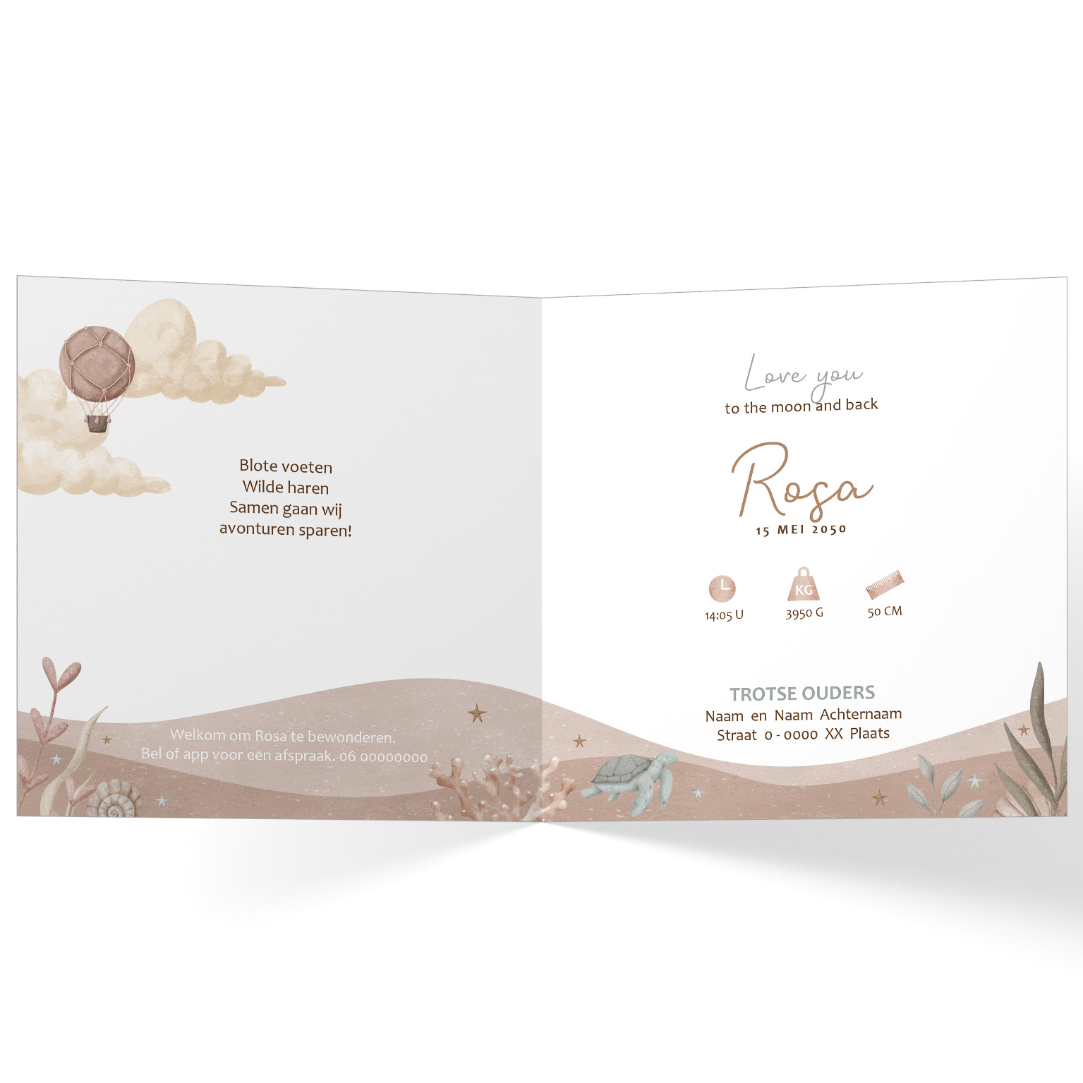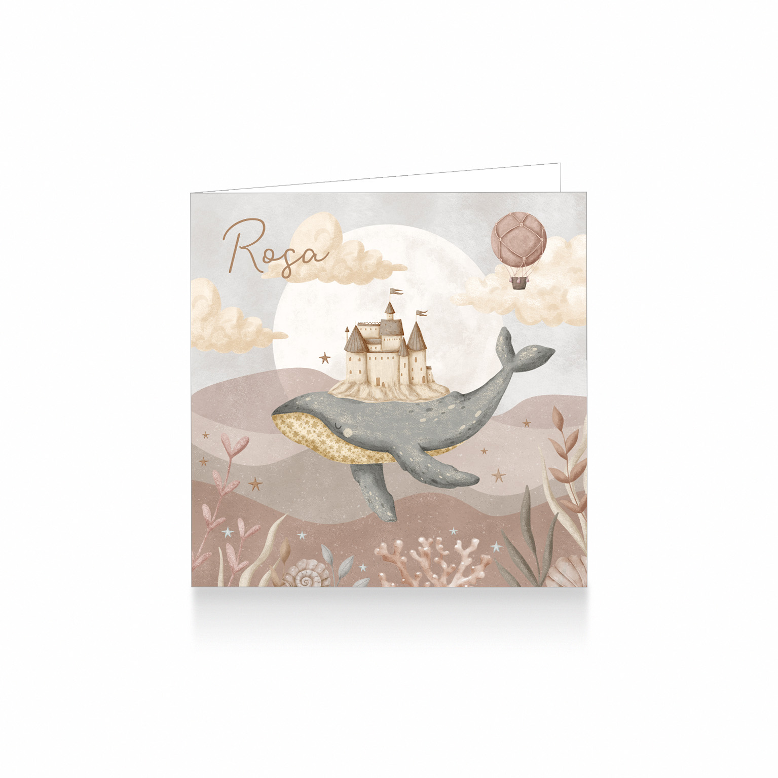 447-Onder de zee aquarel Oceaan dieren geboortekaartje voor een meisje uit de collectie Ocean Dream. Op dit prachtige waterverf kaartje zie je een walvis met kasteel in de zee met sterren en koraal met op de achtergrond een luchtballon en maan. aantal