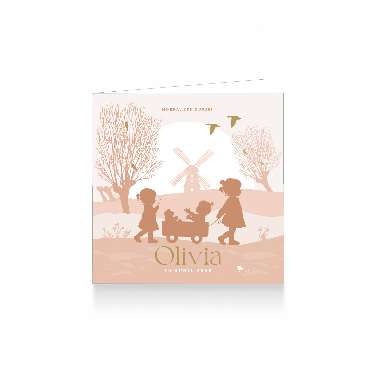 499-Hip silhouet geboortekaartje voor een derde kindje, een meisje. Op dit kaartje zie je grote zus met bolderkar met haar kleine zusje die probeert pluisjes van een blaasbloem te pakken die haar andere zusje blaast van achter de bolderkar in een Hollands landschap met knotwilgen, luchtballon en molen.