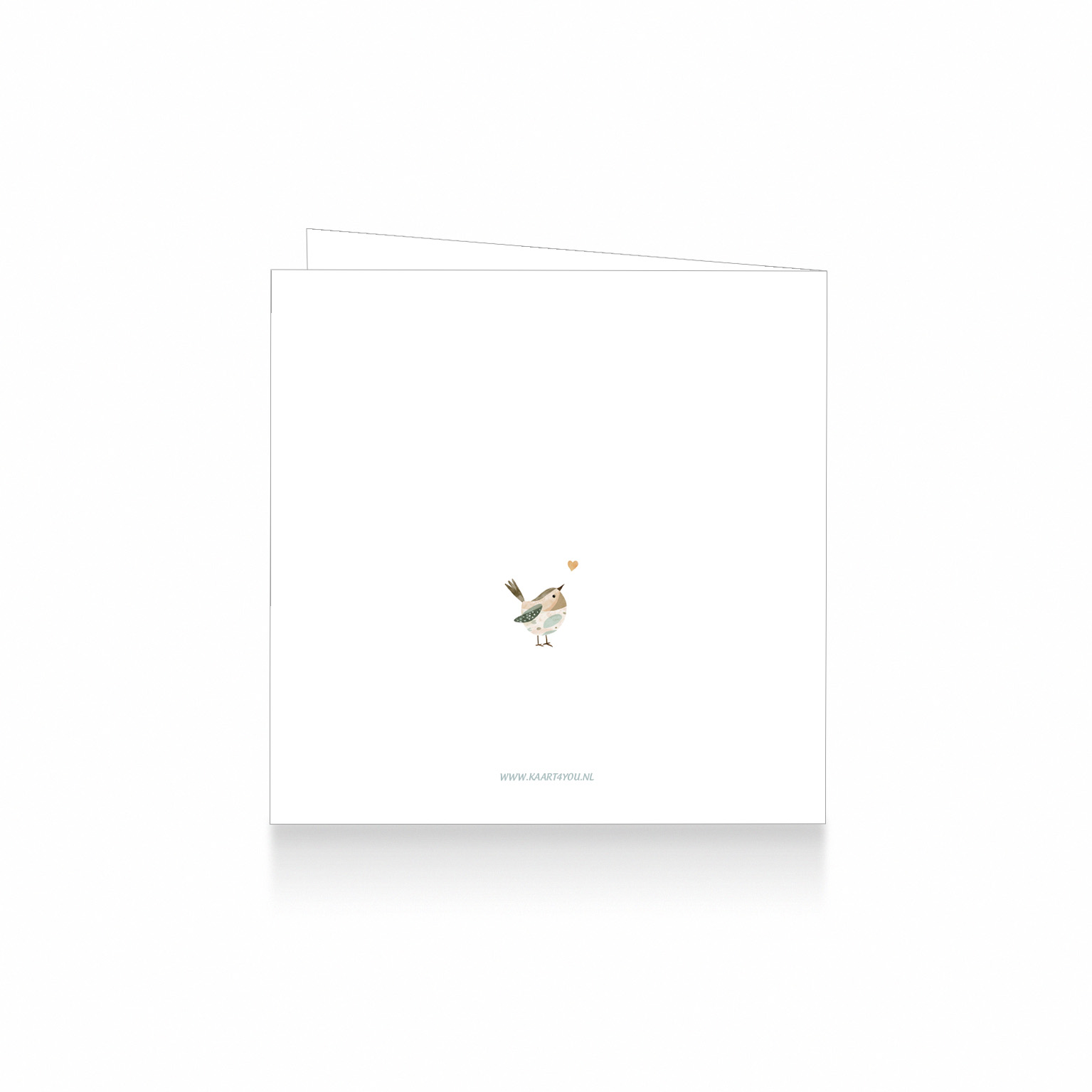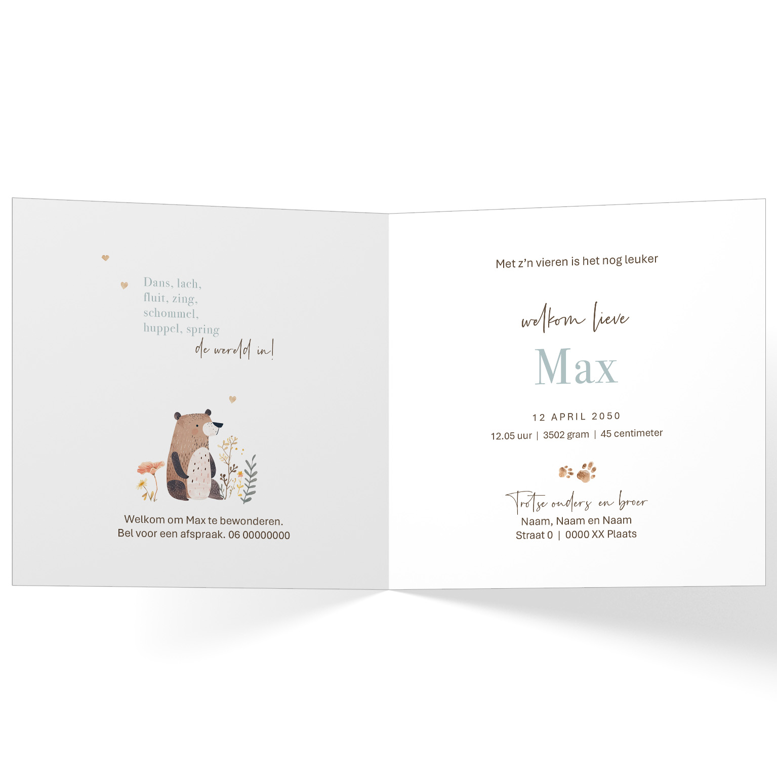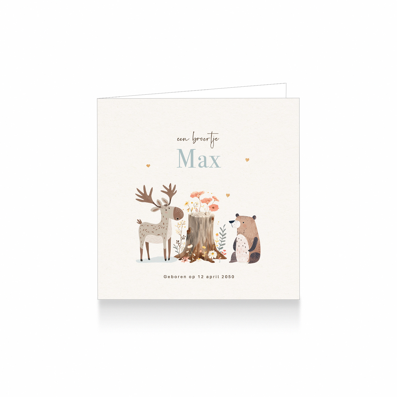 515-Schattig aquarel bosdieren geboortekaartje voor een tweede kindje, een jongen. Op dit lieve kaartje zie je een geschilderde eland en beertje in waterverf tussen prachtige bloemen, takjes, blaadjes op boomstronk en hartjes op een kraft karton achtergrond