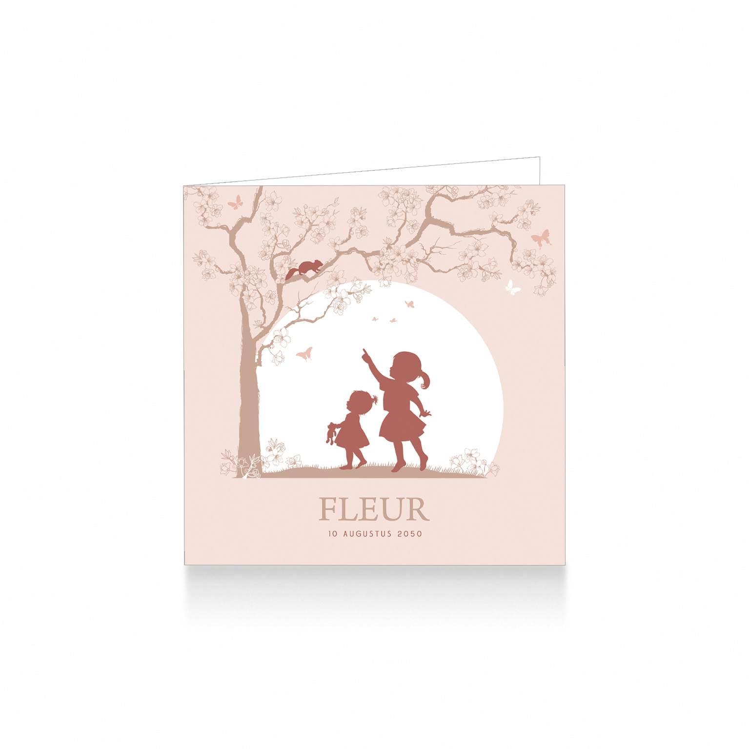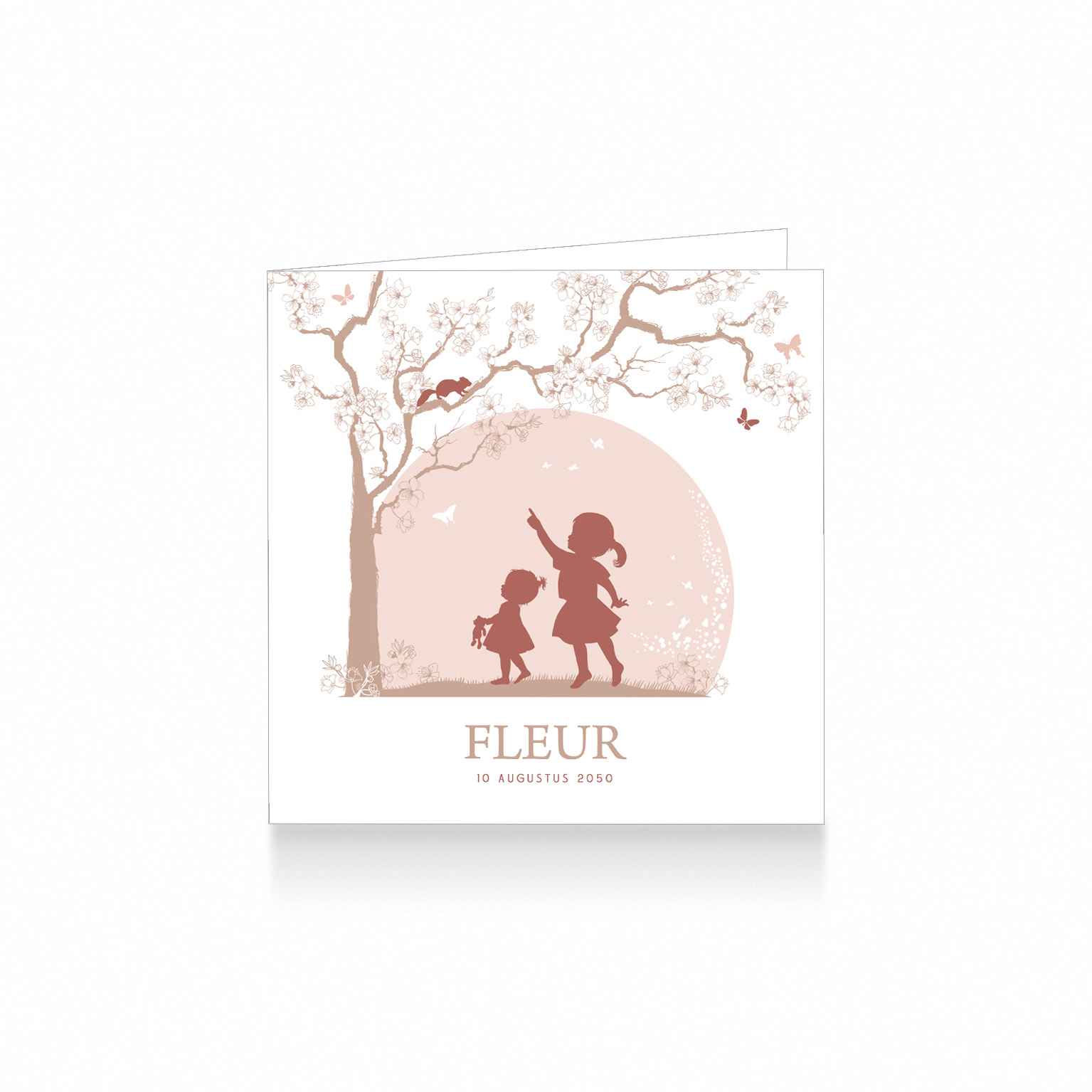 521-Super lief silhouet geboortekaartje voor een tweede kindje, een meisje. Op dit leuke kaartje zie je grote zus en haar kleine zusje onder een prachtige boom met bloemen. Grote zus wijst naar een eekhoorntje. Het kaartje is in mooie beige, roze en roestrood tinten