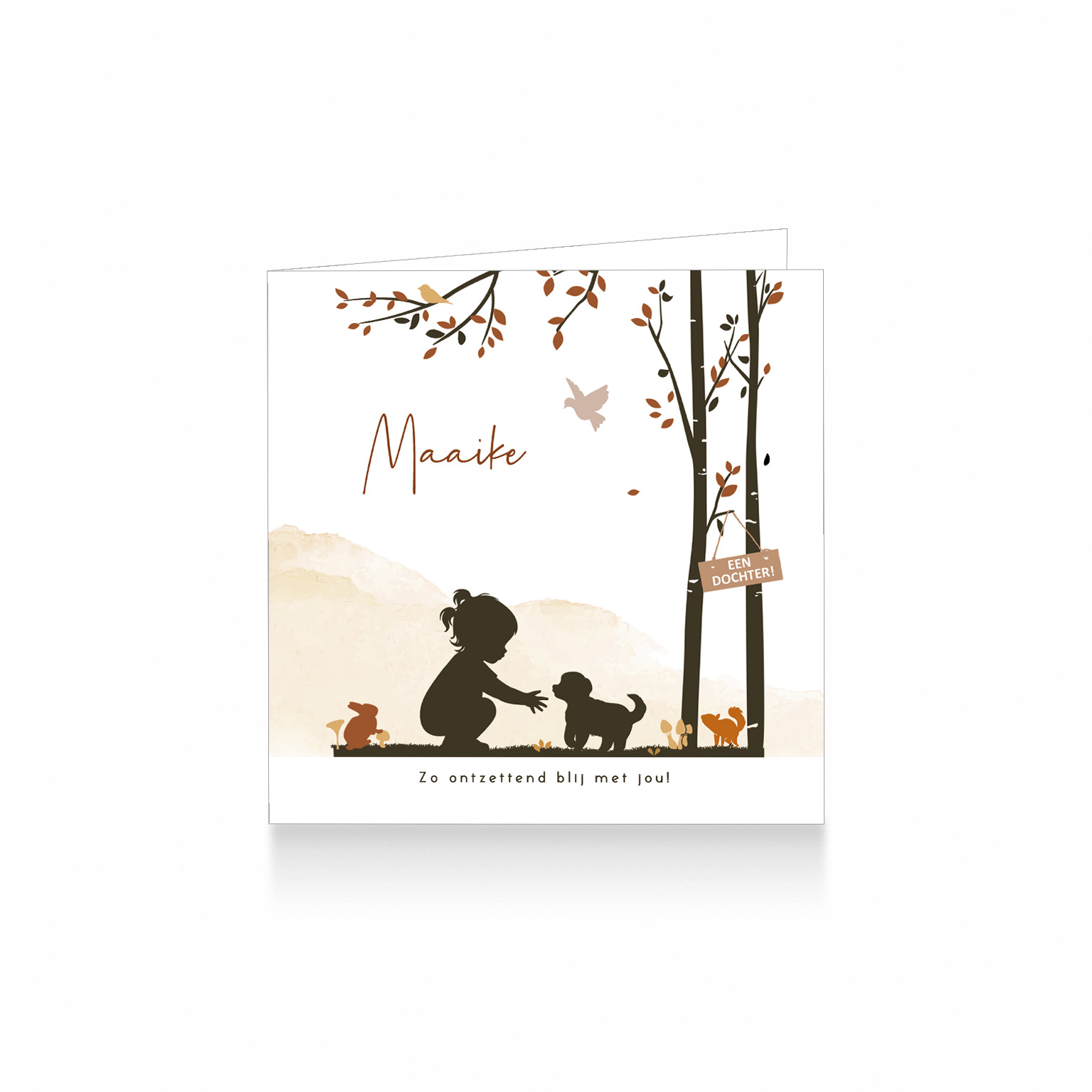 561-Trendy herfst silhouet geboortekaartje voor een meisje van een silhouet meisje met haar puppy hondje in het bos