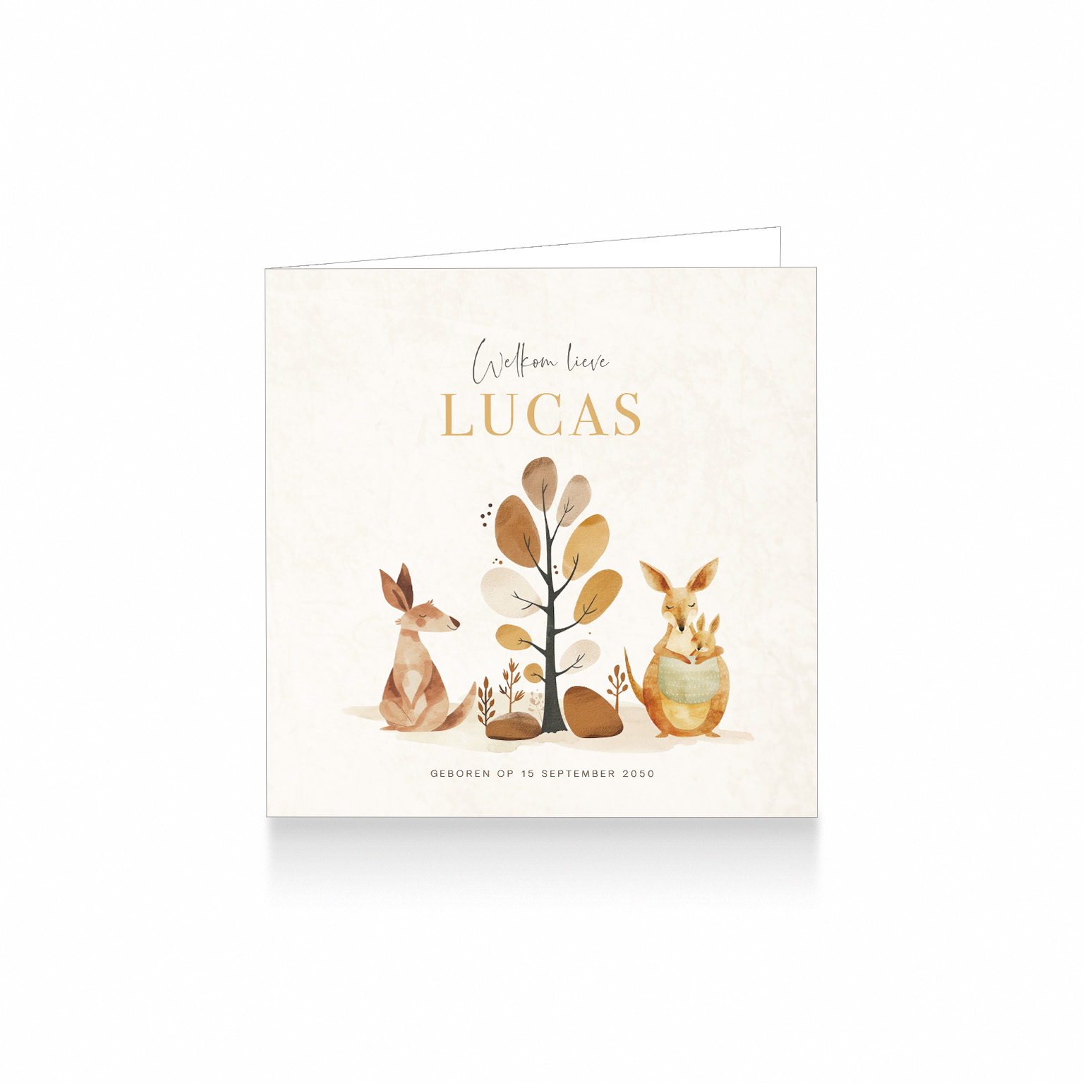 609-Aquarel jungle dieren geboortekaartje voor een jongen. Op dit leuke kaartje zie je familie kangoeroe in waterverf geschilderd en een prachtige boom met takjes en stenen op een lichte vintage oud papierlook achtergrond aantal