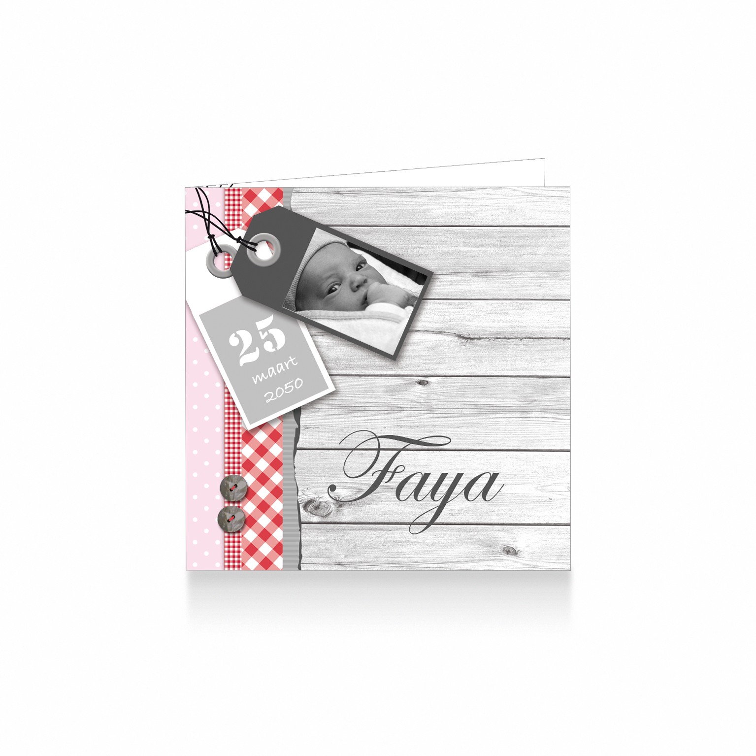 617-hip geboortekaartje voor een meisje met foto labels, op hout, stipjes, rood ruitje en knoopjes aantal