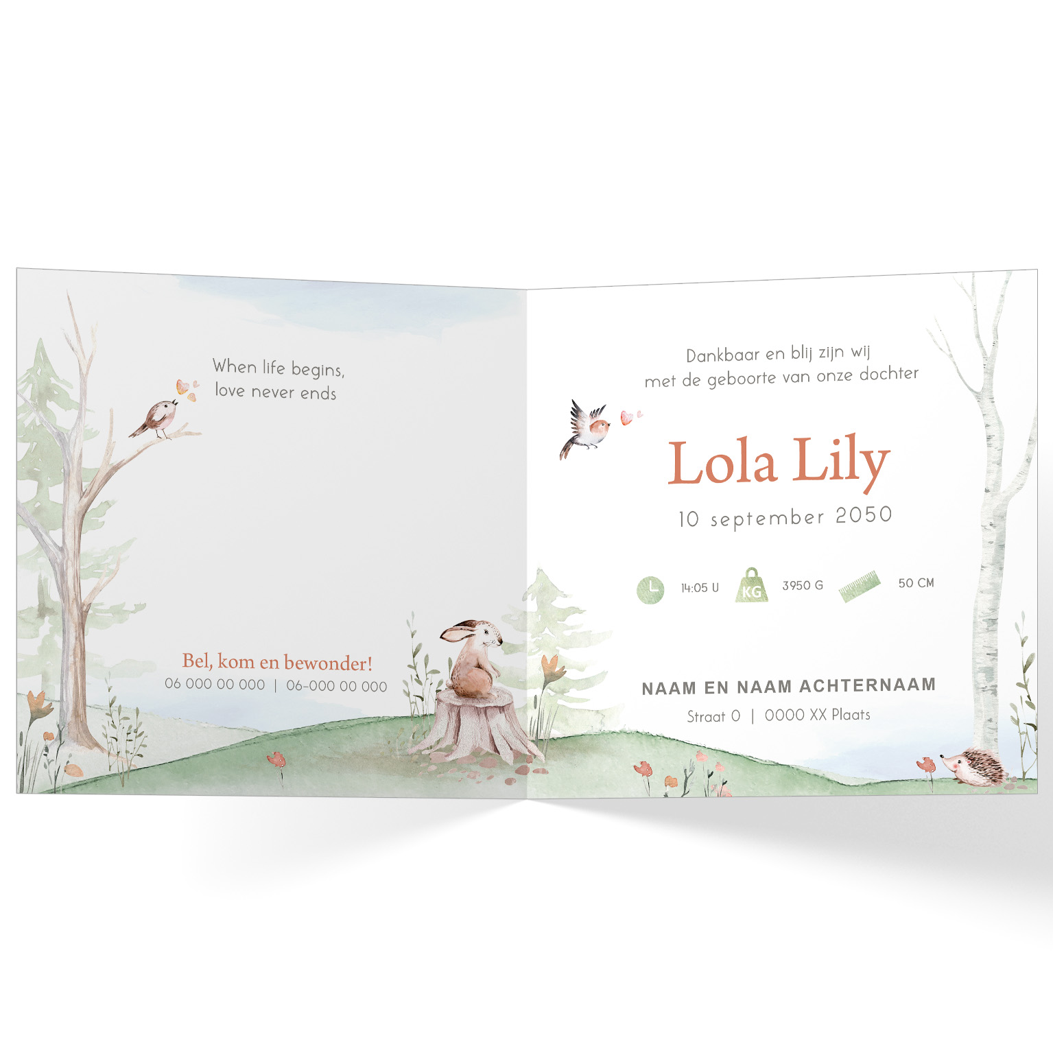 629-Lief waterverf bosdieren geboortekaartje voor een meisje met een hertjes, egeltje, eekhoorn, uil en vogeltje in het bos