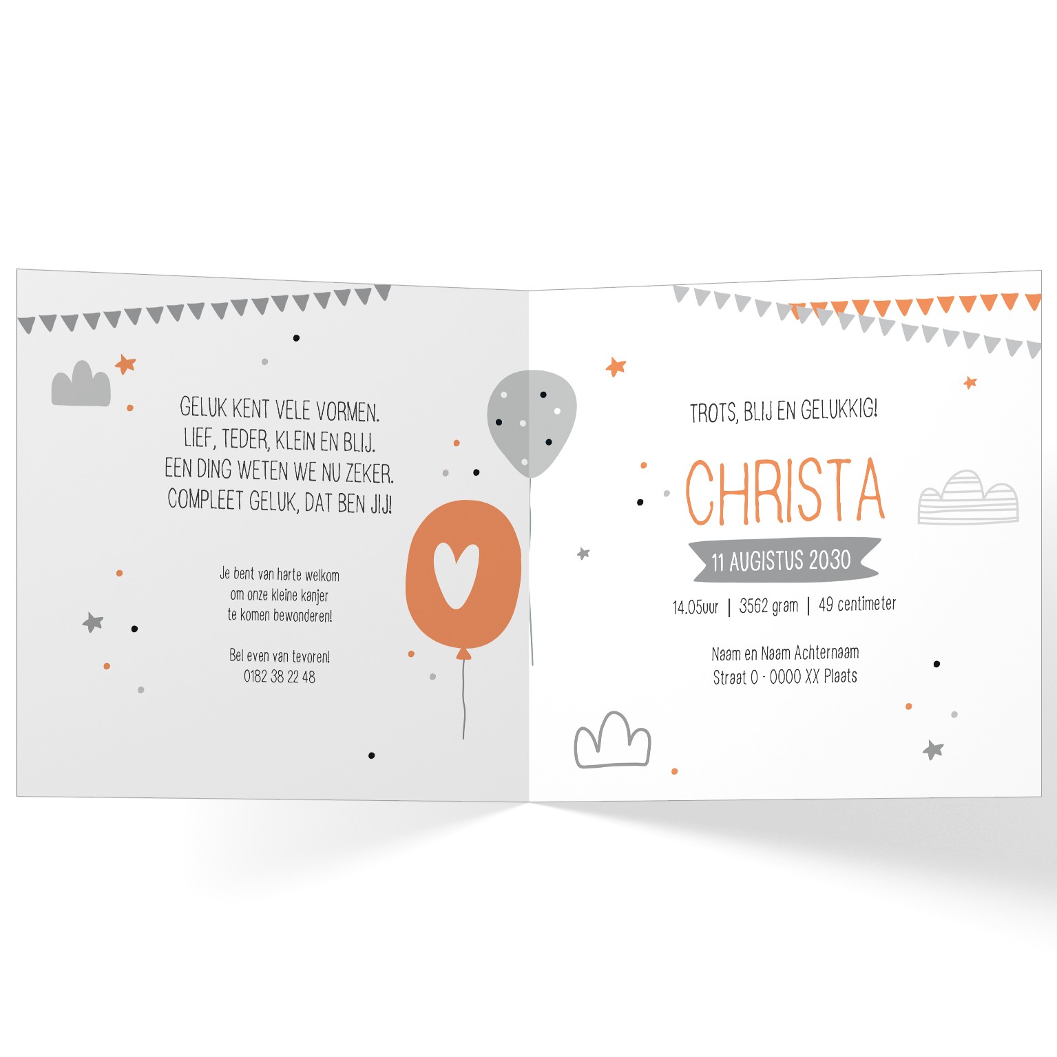 632-vrolijk geboortekaartje voor een meisje met hart, ballon, vaandel, slingers en wolkjes in grijs tinten en oranje