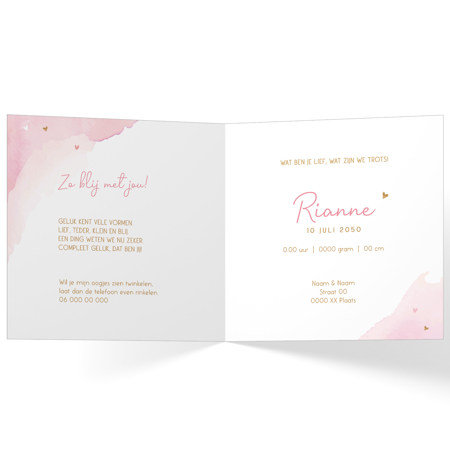 655-Hip en trendy waterverf geboortekaartje voor een meisje met foto op een roze aquarel achtergrond met hartjes in goud en roze kleur