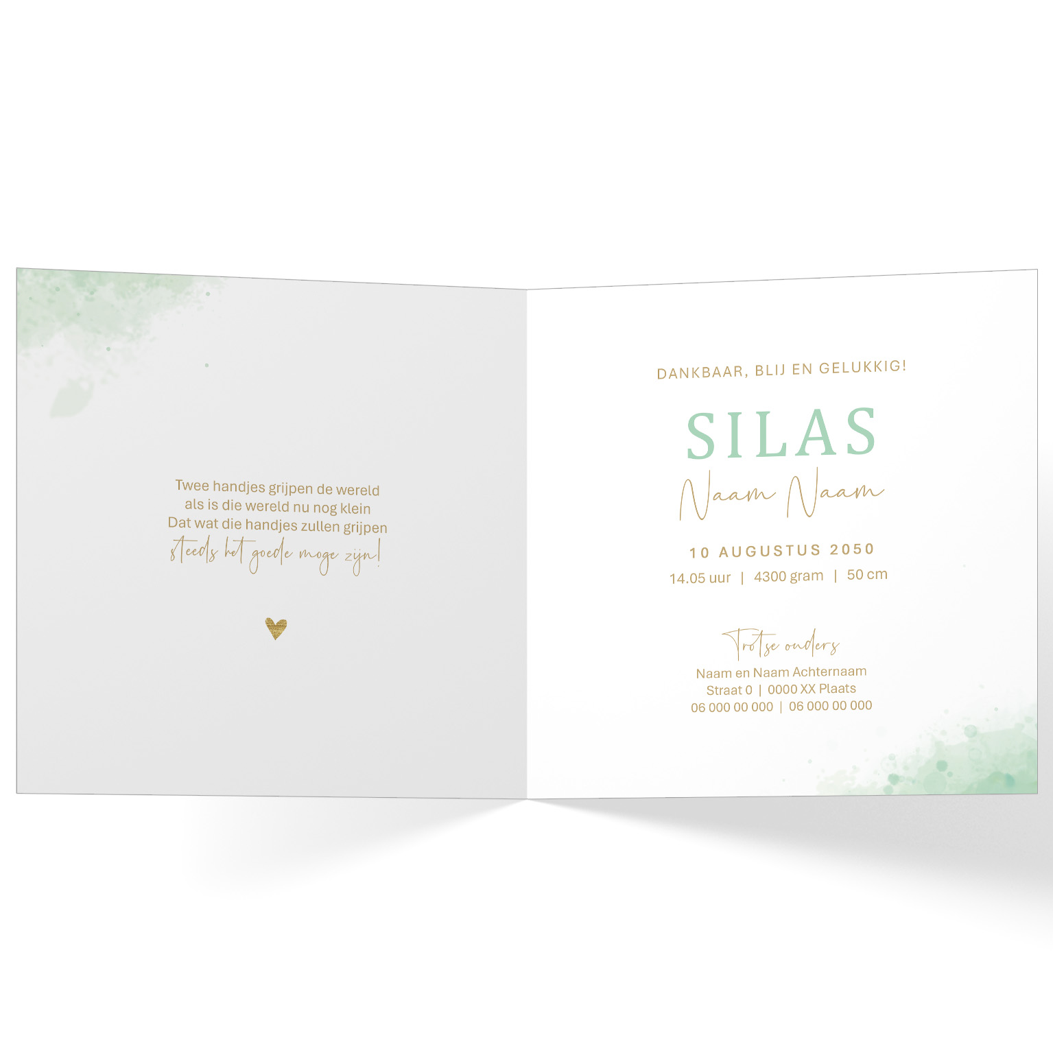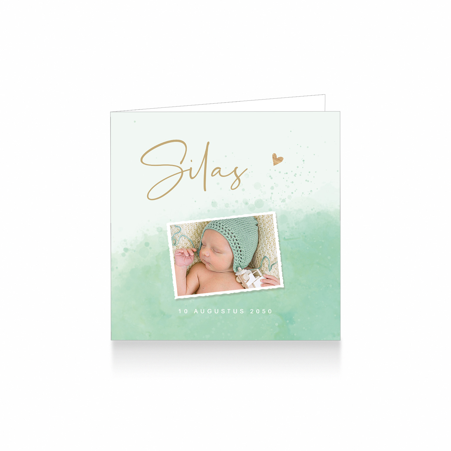 679-Leuk waterverf geboortekaartje voor een jongen met foto op groen aquarel.