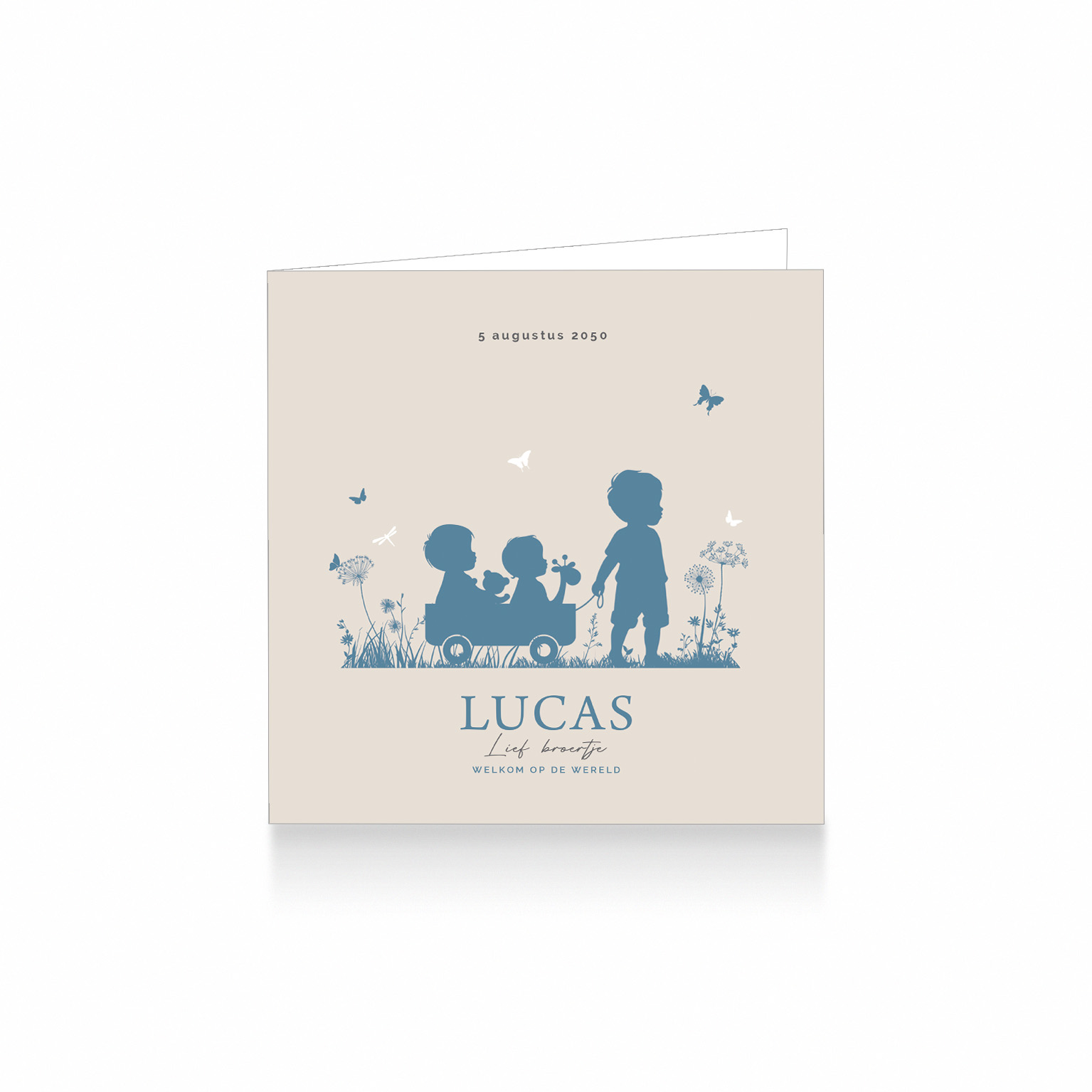 701-Super leuk silhouet geboortekaartje voor een derde kindje, een jongen. Op dit kaartje zie je grote broer met bolderkar met daarin kleine broer en baby broertje met hun knuffels in een landschap met prachtige veldbloemen en vlinders. aantal
