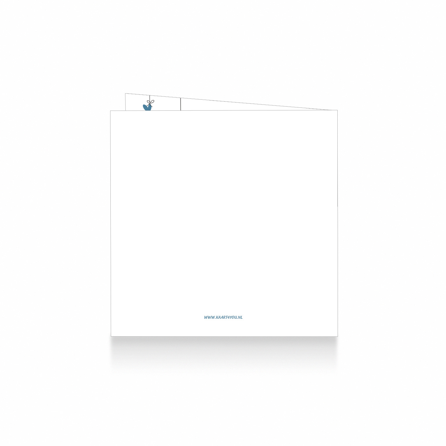 752-Super leuk silhouet geboortekaartje voor een jongen. Op dit kaartje zie je een jongen in een loop vrachtwagen met een aanhangwagentje met speelgoed in blauw op kraft karton met hangende hartjes en vlinders. aantal
