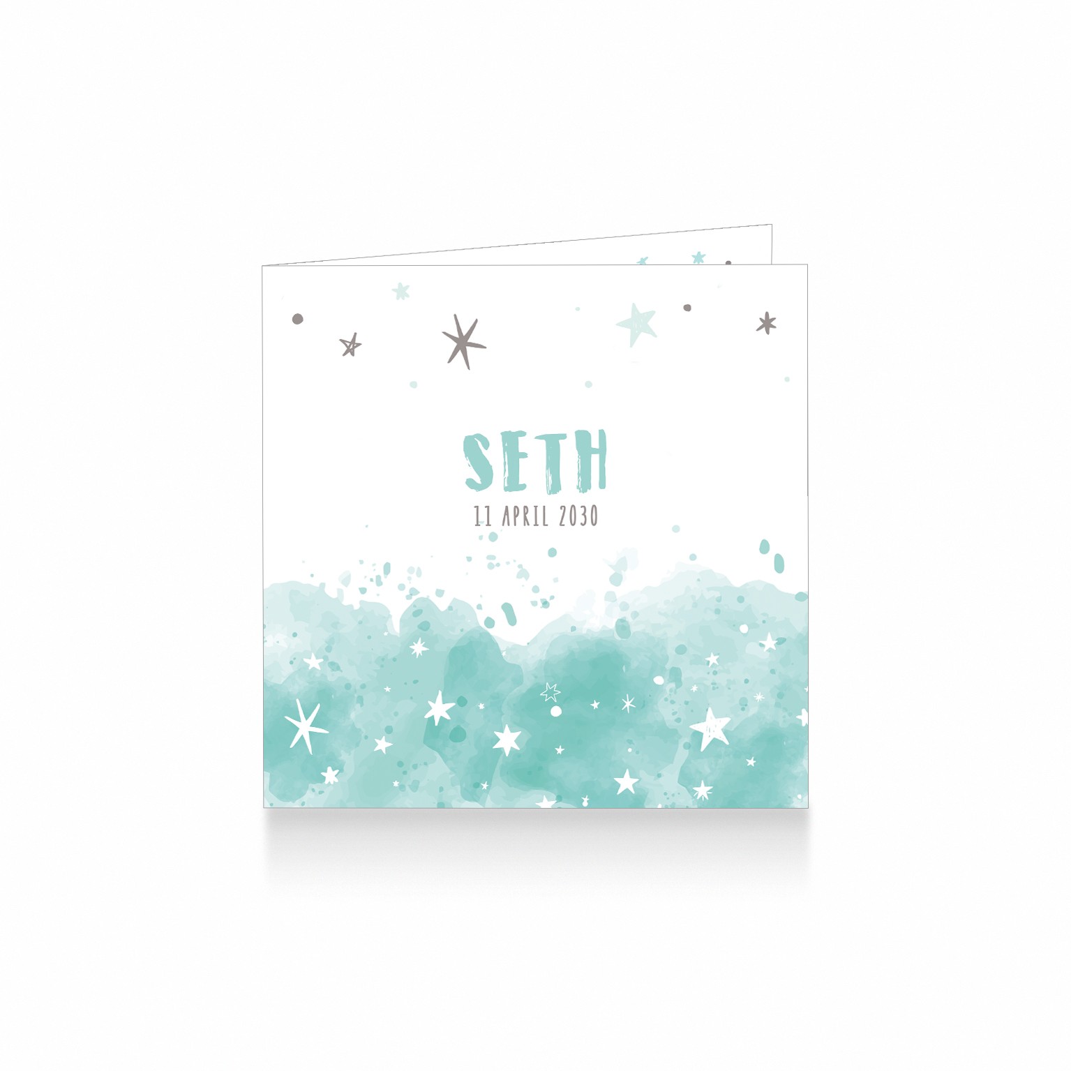 790-trendy aquarel geboortekaartje voor een jongen met sterretjes in zeegroen tint en grijs aantal