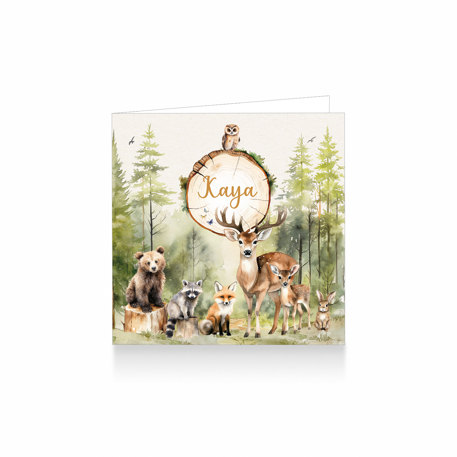 791-Prachtig waterverf geboortekaartje met dieren voor een meisje. Op dit kaartje zie je handgeschilderde bosdieren zoals een vos, hertjes, uil, beer en wasbeer op een boomstronk met op de achtergrond een aquarel geschilderd bos. aantal