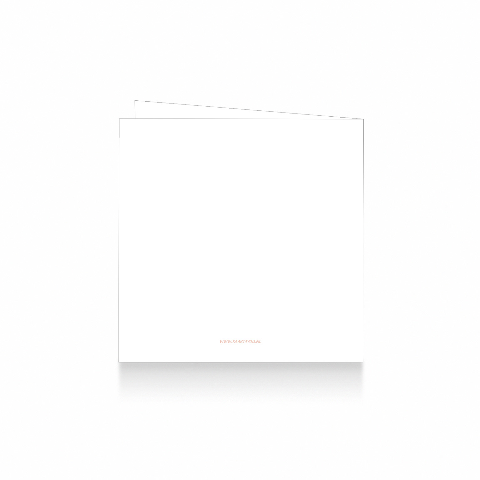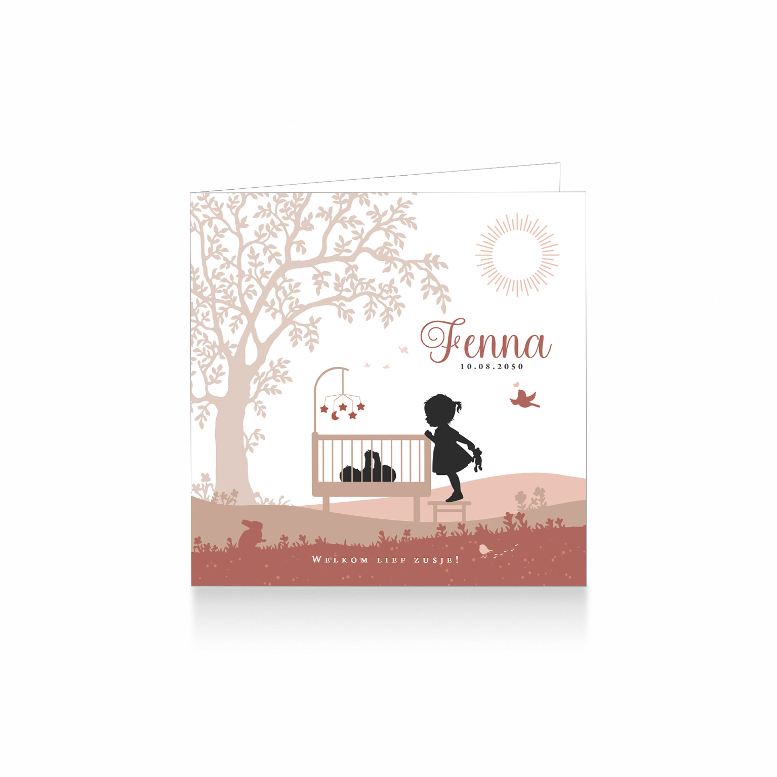 804-Lief silhouet geboortekaartje voor een tweede kindje, een meisje. Op dit kaartje zie je een baby meisje in ledikantje met mobiel en haar grote zus kijken over het randje van het ledikantje toe onder een boom tussen bloemetjes, vlinders en konijntje.