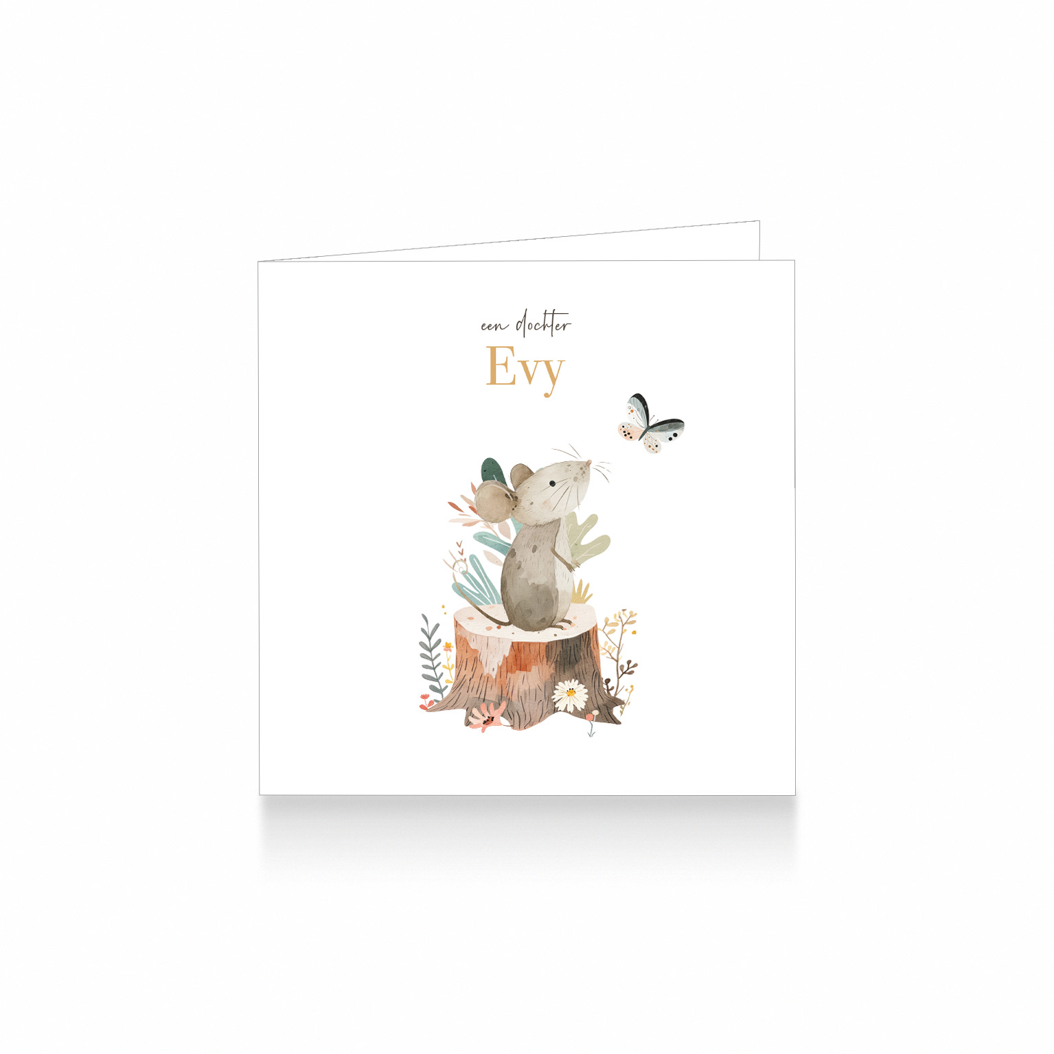 812-Schattig aquarel bosdieren geboortekaartje voor een meisje. Op dit lieve kaartje zie je een geschilderd muisje in waterverf op een boomstronk met bloemen, takjes en blaadjes op een witte achtergrond met vlinder aantal
