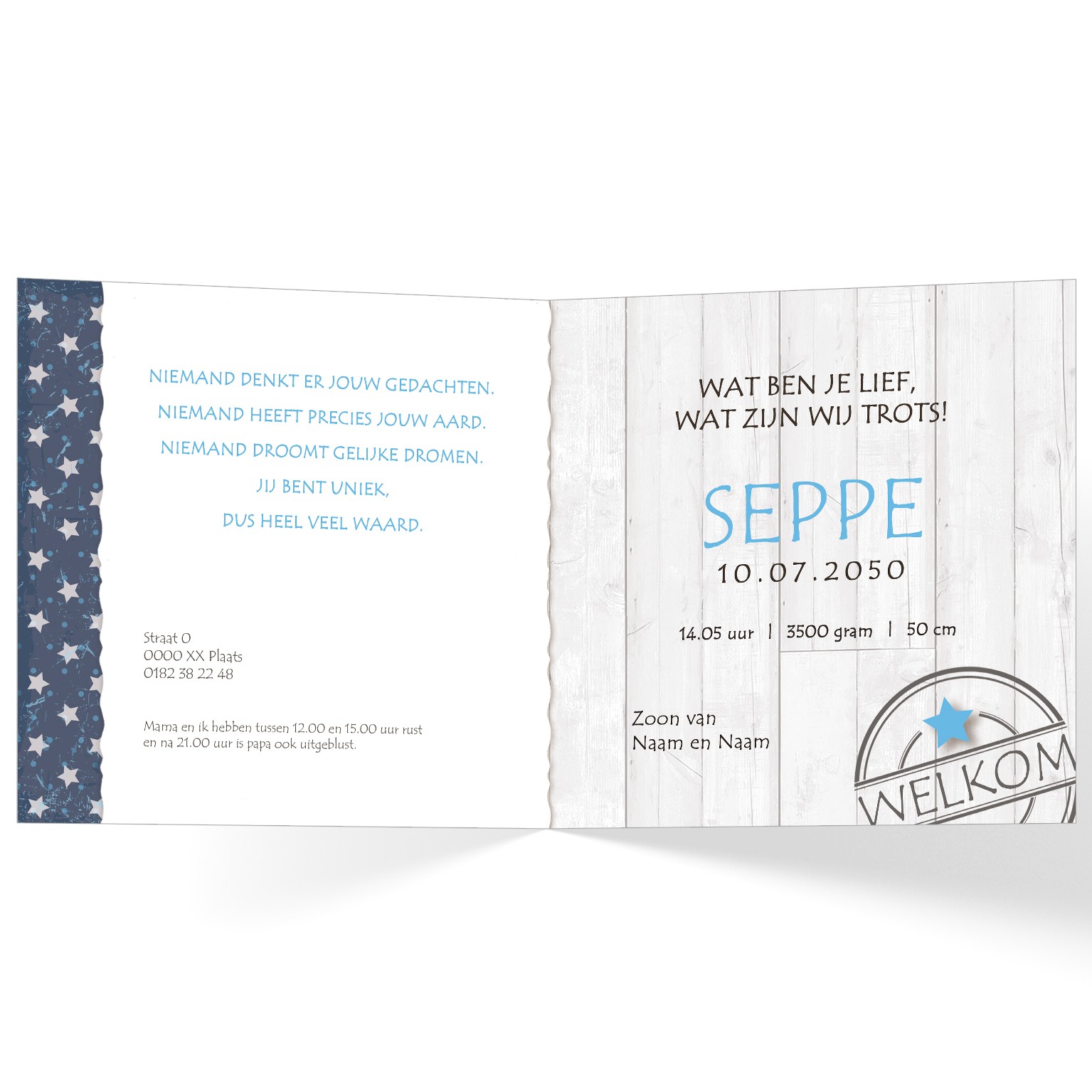 820-Geboortekaartje voor een jongen met foto, een leren naamlabel, stempel op hout en sterren patroon in blauwe tinten aantal