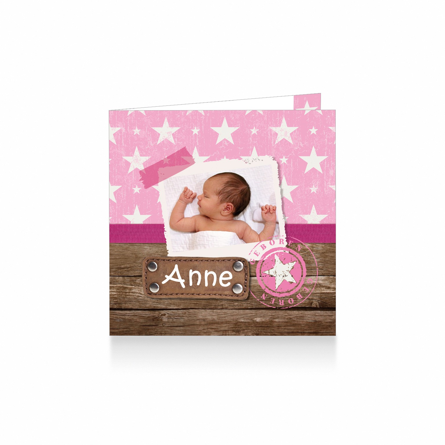 840-stoer geboortekaartje voor een meisje met foto, leer naamlabel en stempel op een houten achtergrond met sterren patroon in roze tinten aantal