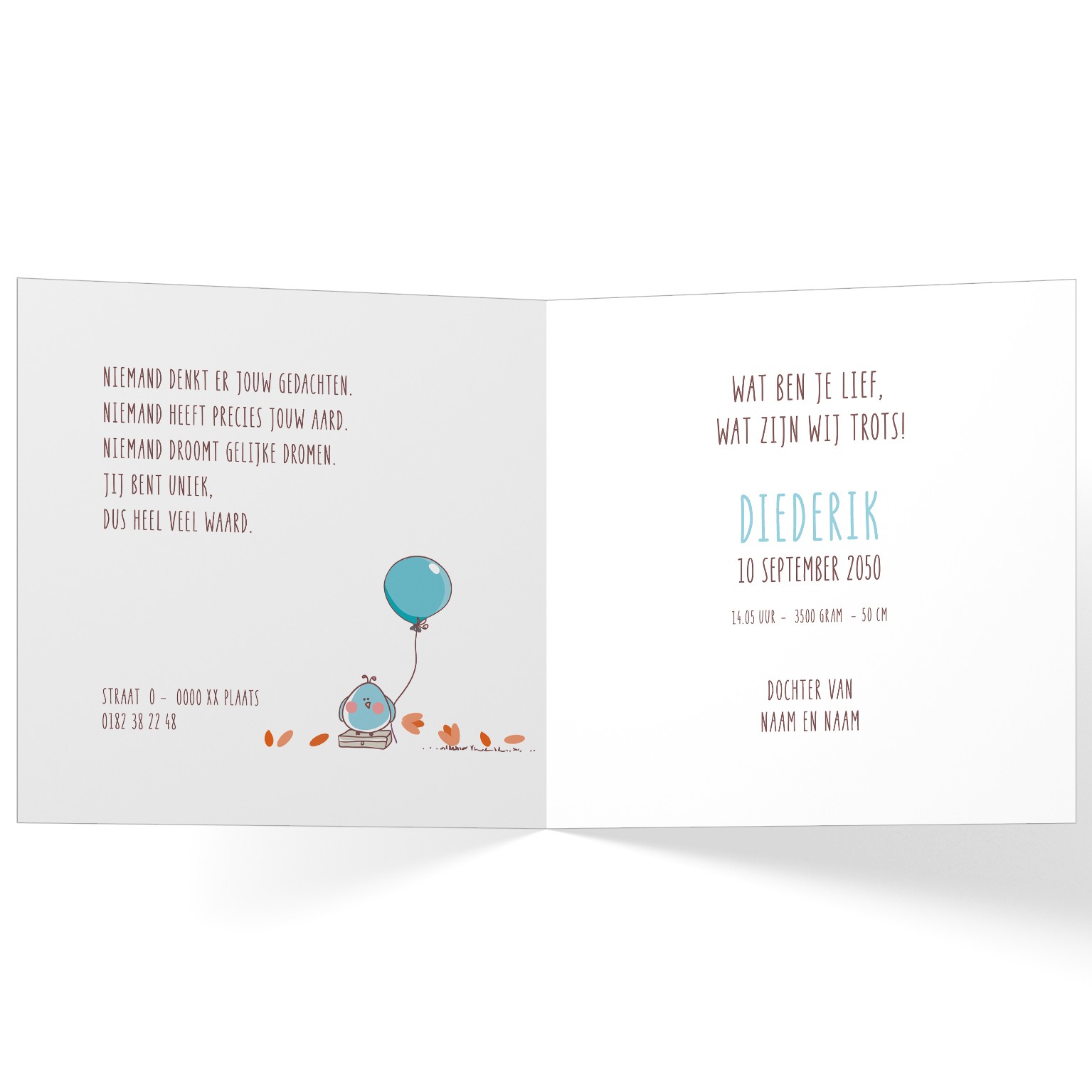 875-lief getekend geboortekaartje voor een jongen van een boom in herfst tinten met vogeltjes aantal