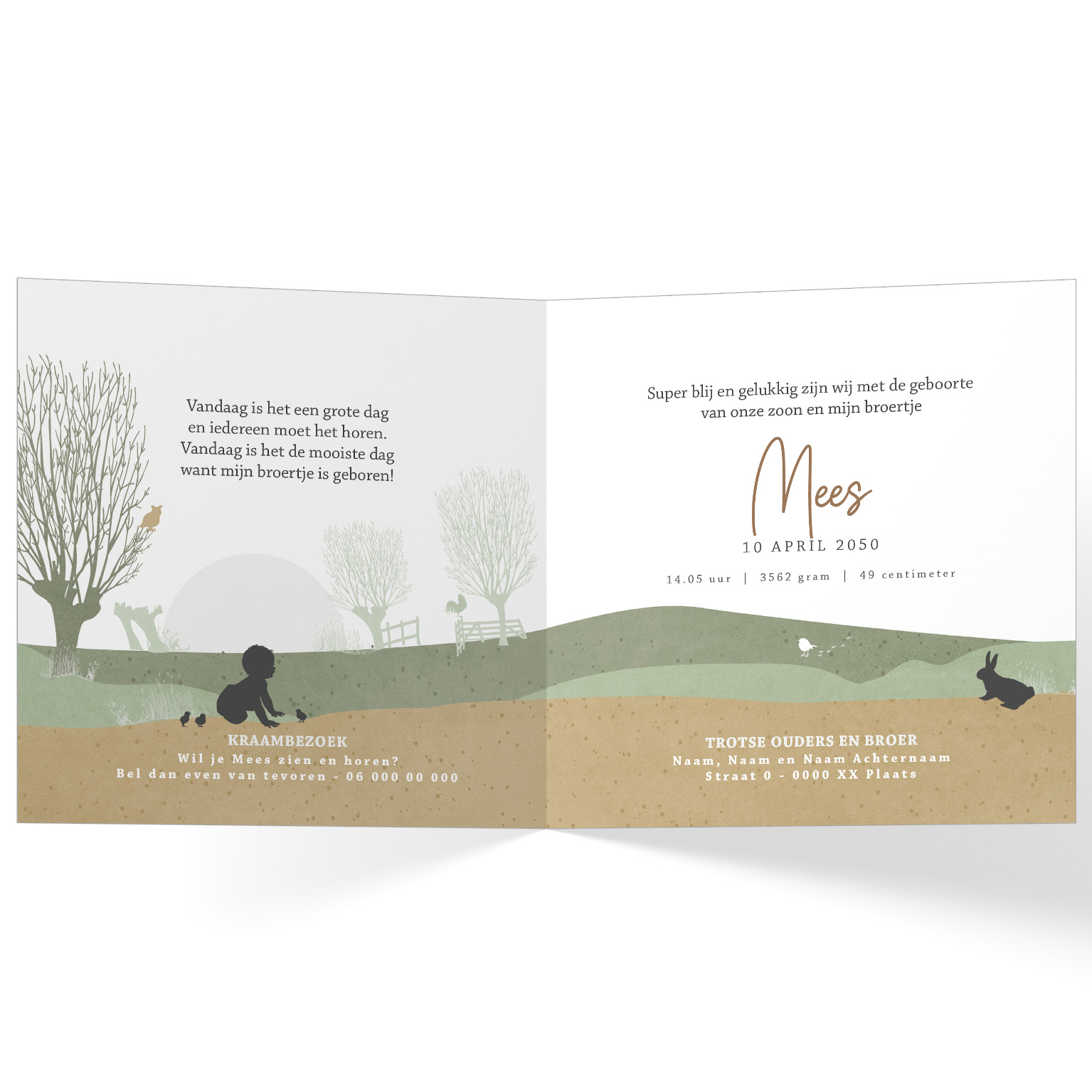 905-Super leuk silhouet geboortekaartje voor een tweede kindje, een jongen. Op dit leuke kaartje zie je grote broer op een tractor met aanhangwagentjes met daarin zijn kleine baby broertje en boerderijdieren in een landschap met knotwilgen.