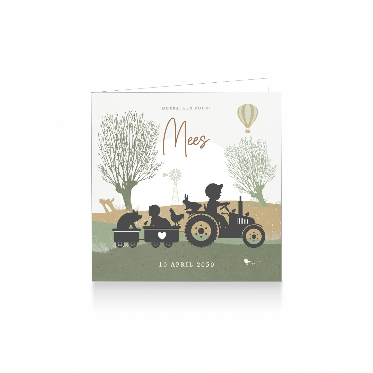 905-Super leuk silhouet geboortekaartje voor een tweede kindje, een jongen. Op dit leuke kaartje zie je grote broer op een tractor met aanhangwagentjes met daarin zijn kleine baby broertje en boerderijdieren in een landschap met knotwilgen. aantal