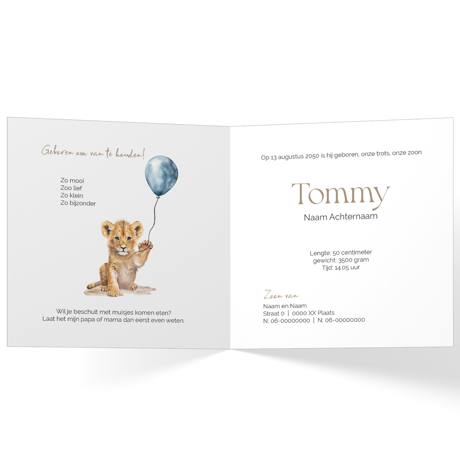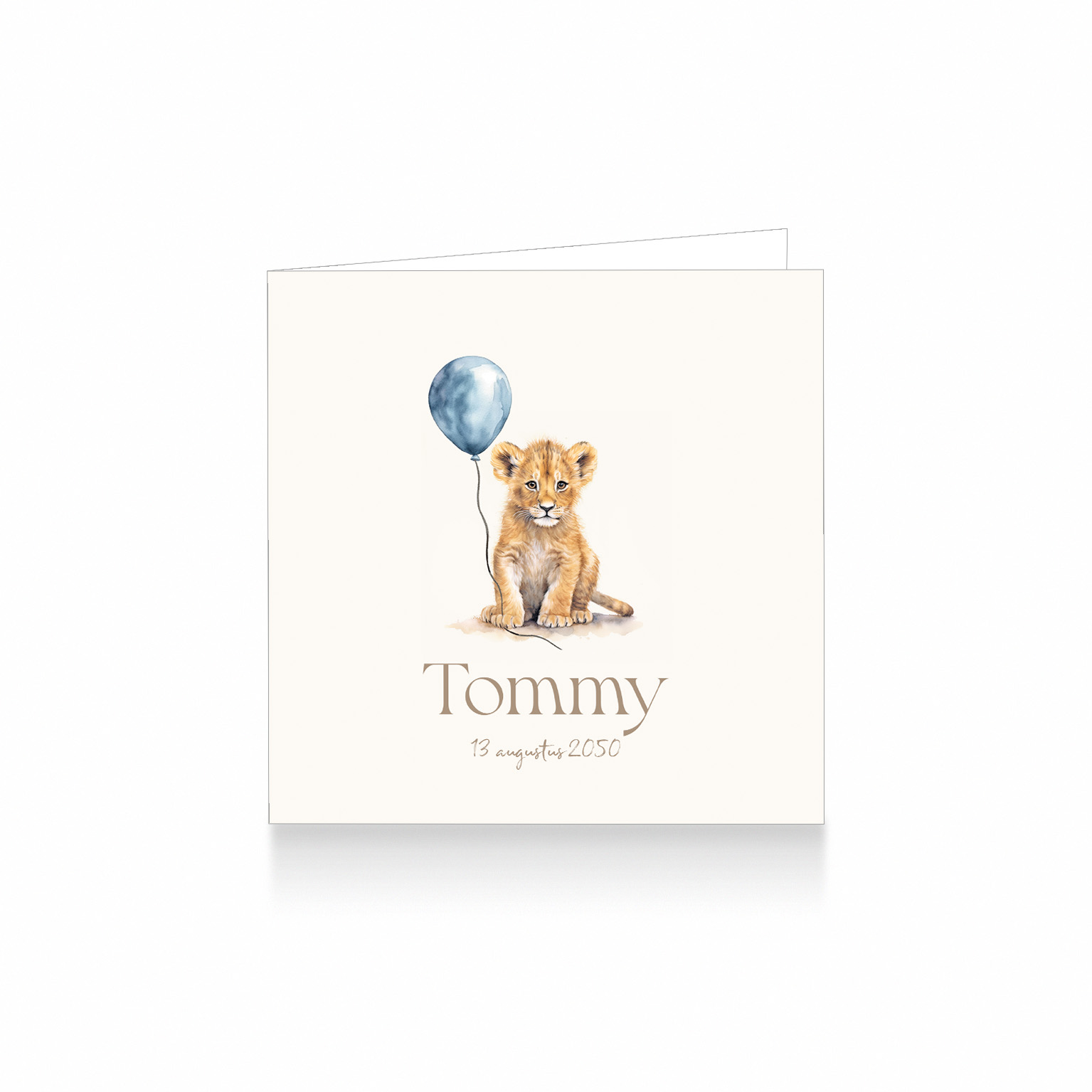 916-Lief aquarel geboortekaartje voor een jongen met een geschilderd leeuwtje met een blauwe ballon in waterverf op een beige achtergrond. aantal