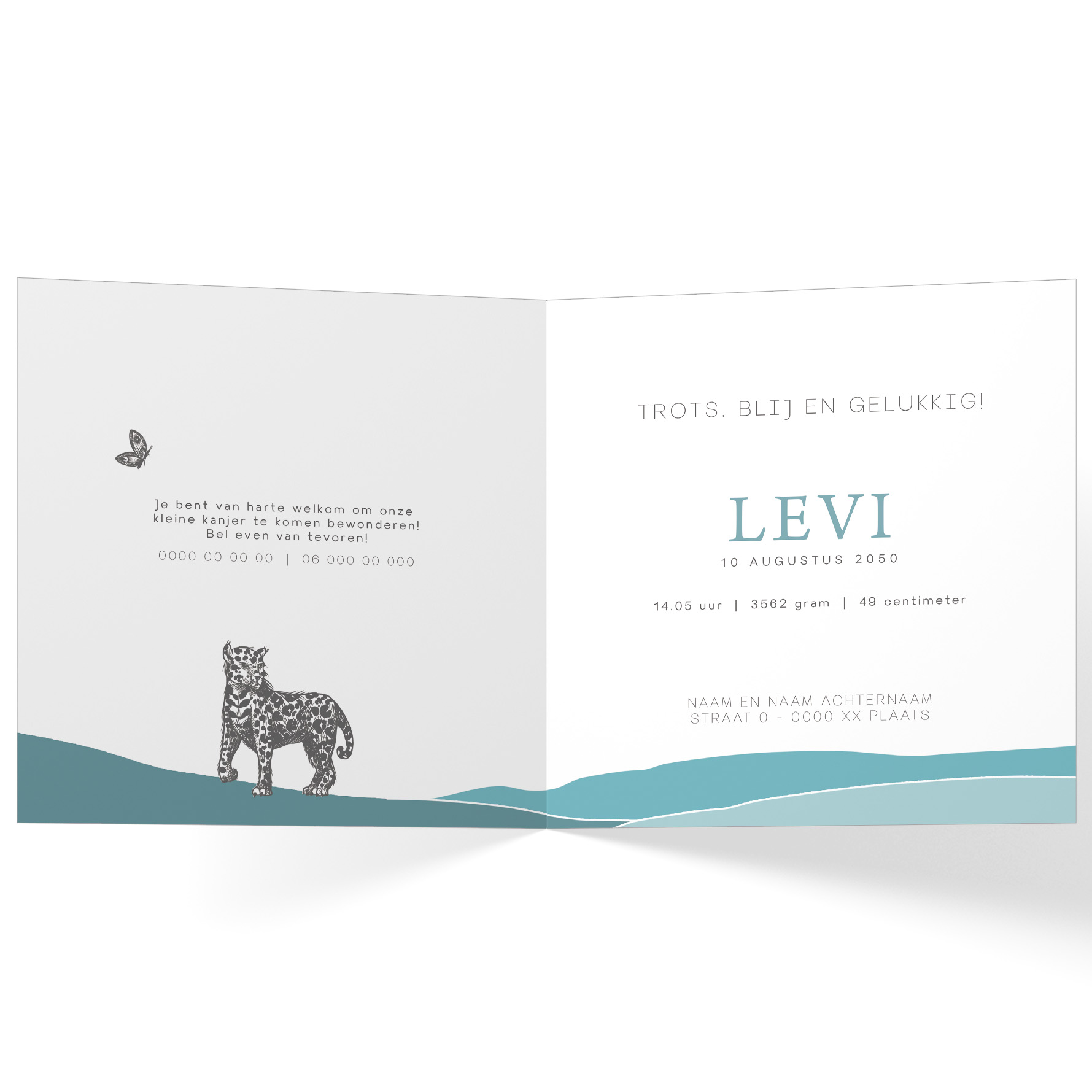 931-Trendy geboortekaartje voor een jongen met gestapelde dieren waaronder een olifant, zebra en toekan met takje en een vlinder in een heuvelachtig landschap met lijnen in blauw tinten aantal