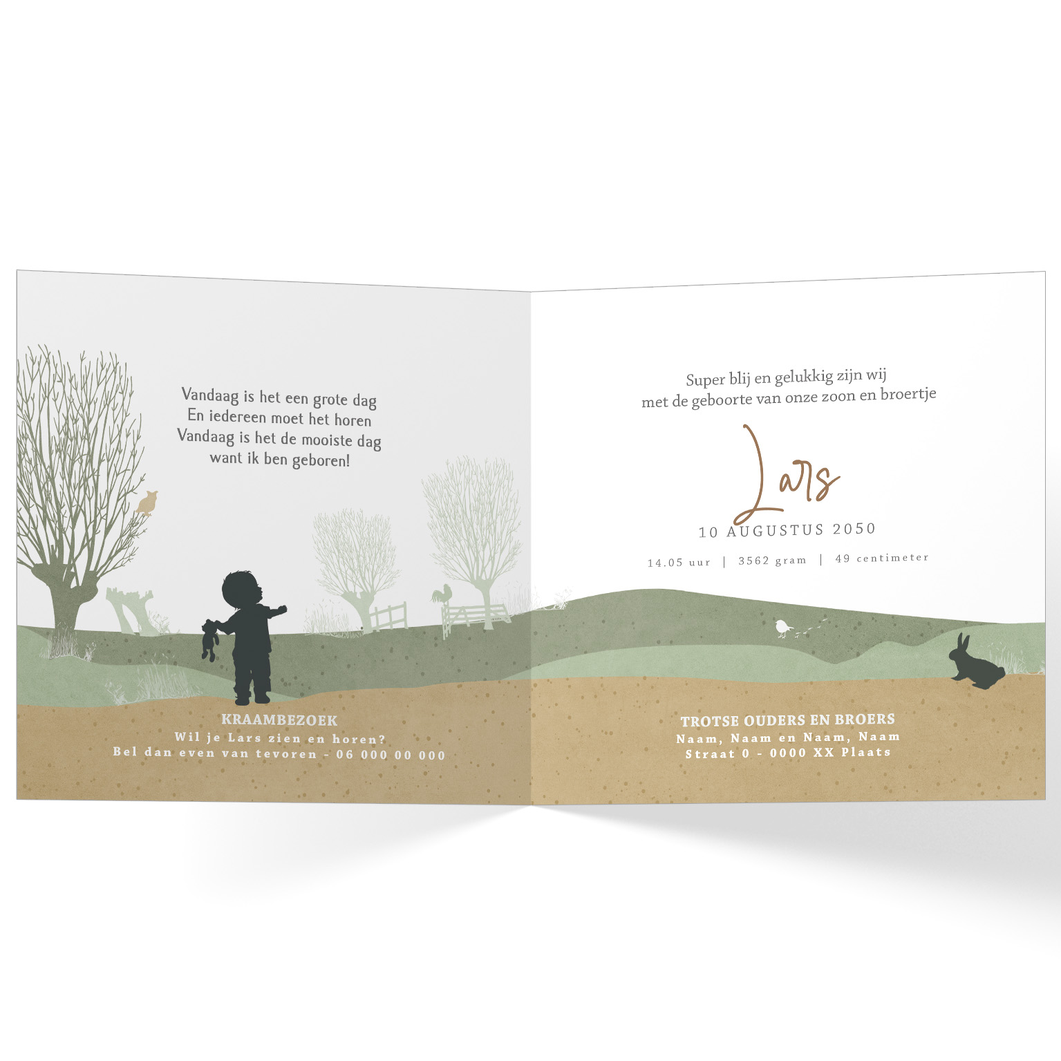 956-Super leuk silhouet geboortekaartje voor een derde kindje, een jongen. Op dit kaartje zie je grote broers wandelen met een bolderkar met daarin hun kleine baby broertje in een Hollands landschap. Kleine broer kijkt naar een luchtballon. aantal