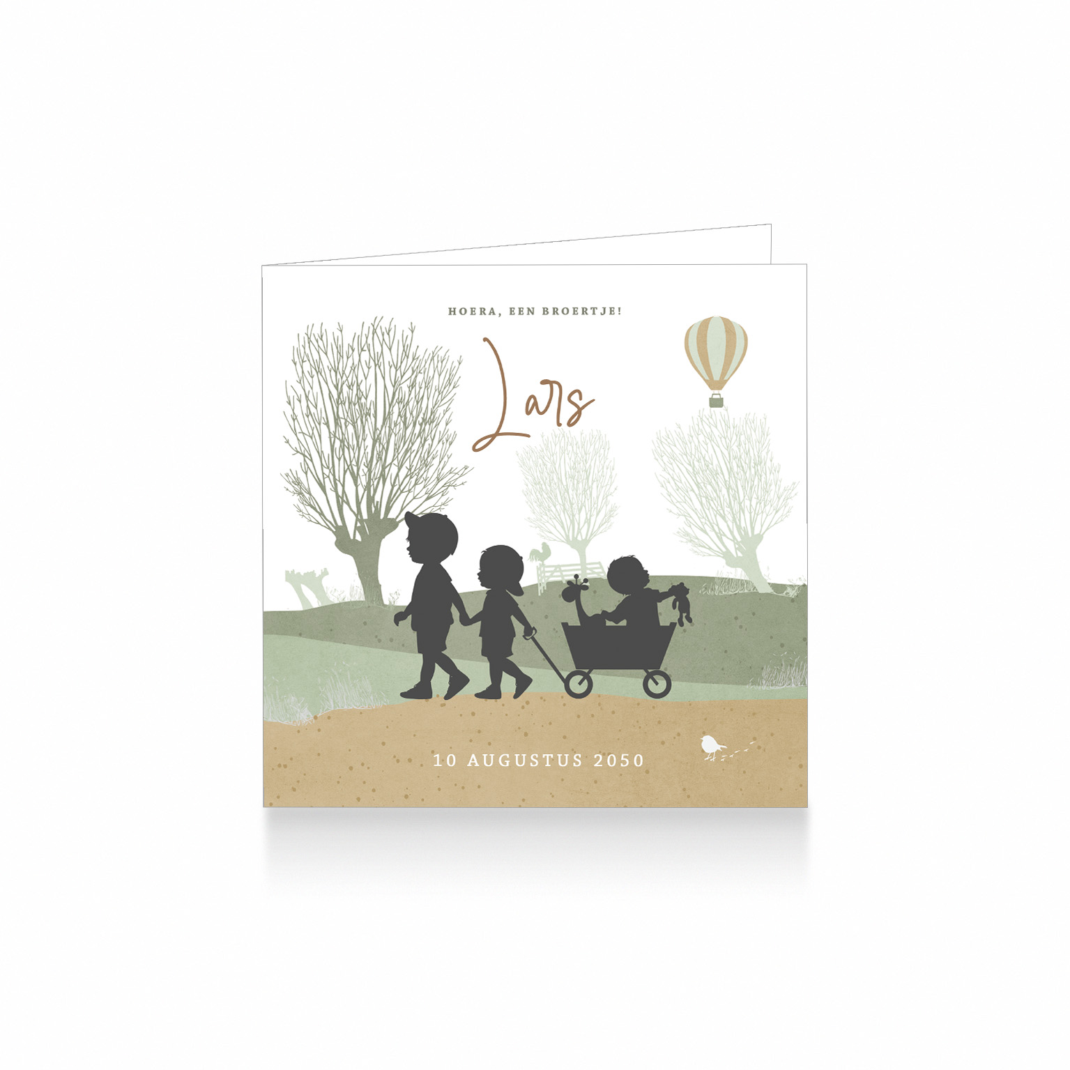 956-Super leuk silhouet geboortekaartje voor een derde kindje, een jongen. Op dit kaartje zie je grote broers wandelen met een bolderkar met daarin hun kleine baby broertje in een Hollands landschap. Kleine broer kijkt naar een luchtballon.