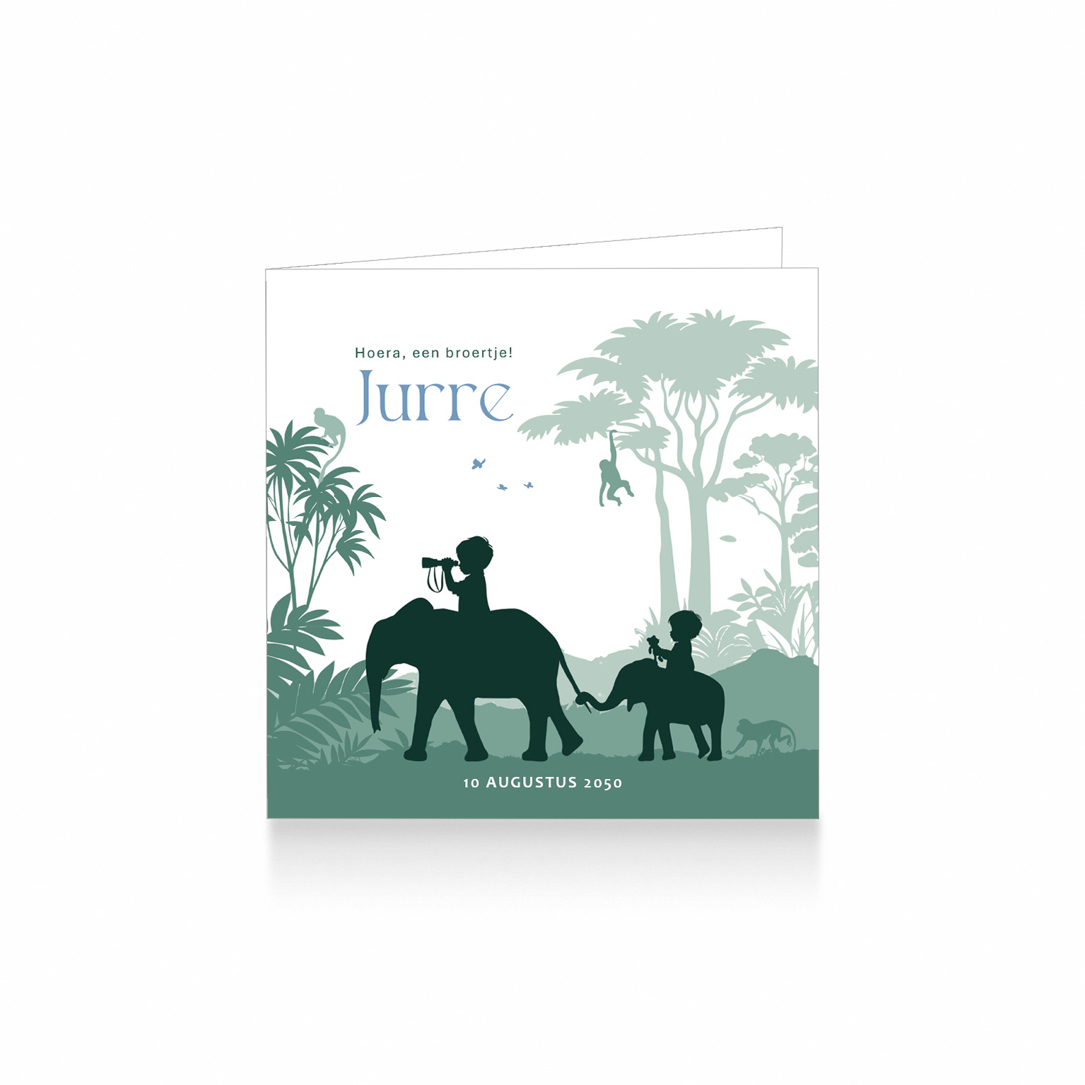 986-Hip jungle safari silhouet geboortekaartje voor een tweede kindje, een jongen. Op dit leuke kaartje zie je grote broer met verrekijker en zijn kleine broertje op olifantjes in de jungle tussen prachtige tropische planten, bomen en aapjes.